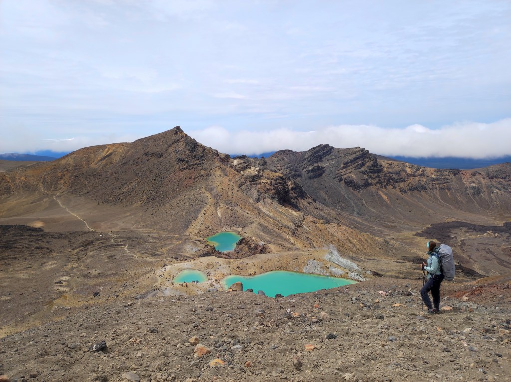 Ce décor héberge le Tongariro Northern Circuit, l’une des « 10 Great Walks » de Nouvelle-Zélande. Ces grandes randonnées sont connues pour être les plus belles du pays. Le Tongariro Northern Circuit est l’une des 3 situées sur l’île du Nord.  Il est possible de faire la version courte en une journée appelée Tongariro Crossing, mais nous avons choisi de faire la boucle de 44km en 2 jours, et de dormir en campement avec notre tente nouvellement achetée ! Le premier jour nous partons sous un ciel très chargé  : l’arrivée dans le Mordor en brumes, ça a son charme ! Le ciel s’est ensuite dégagé pour nous laisser apprécier la vue sur le mont Ngauruhoe, puis la vue sur les lacs Emeraude.
