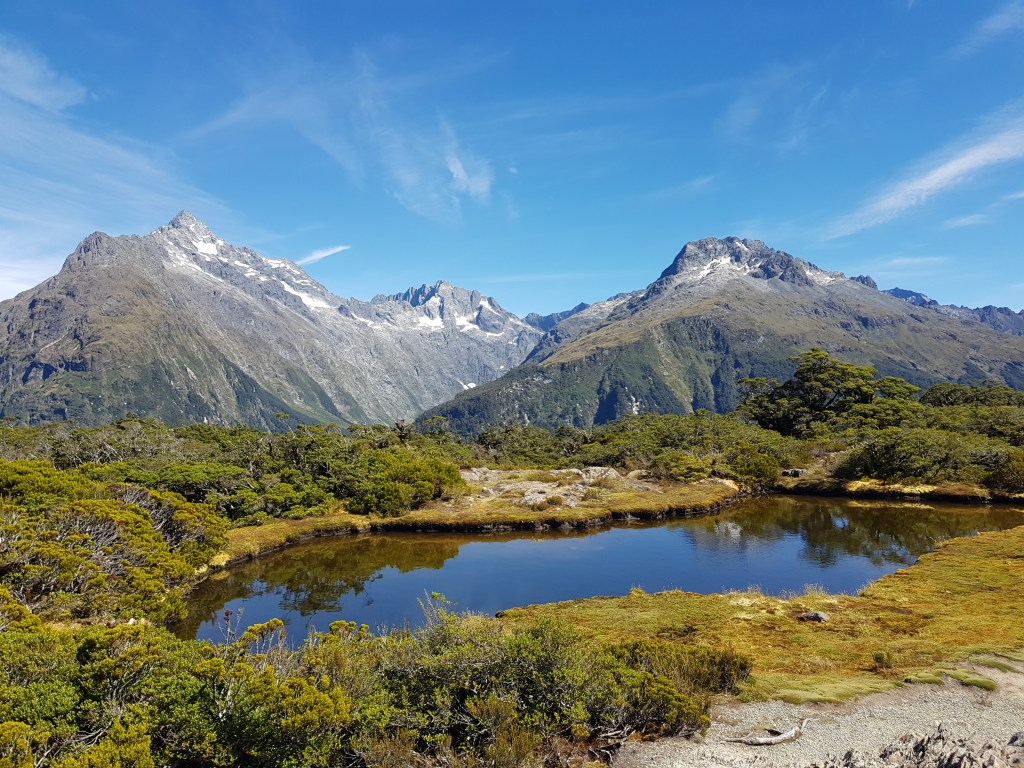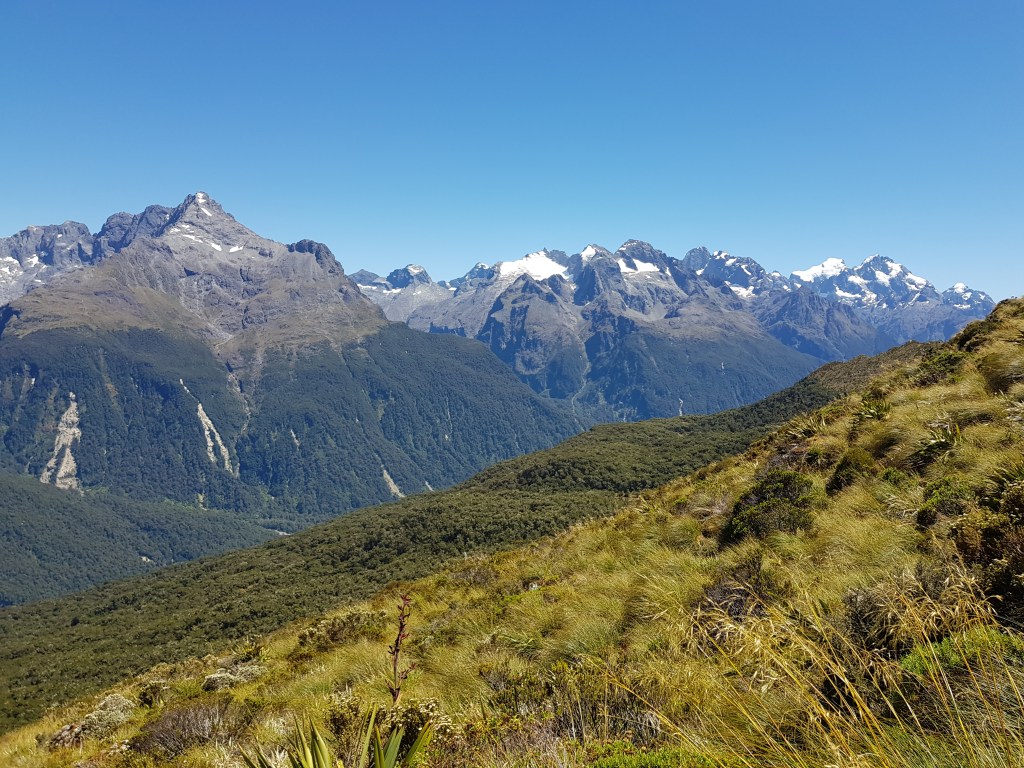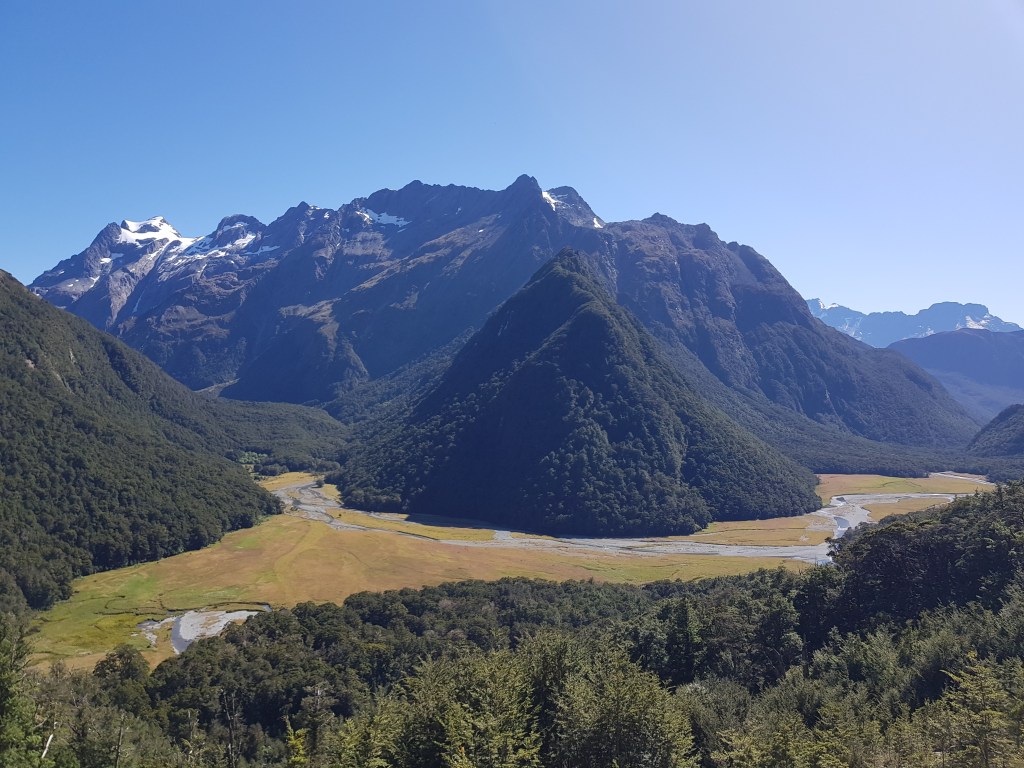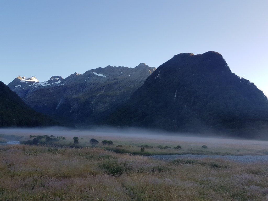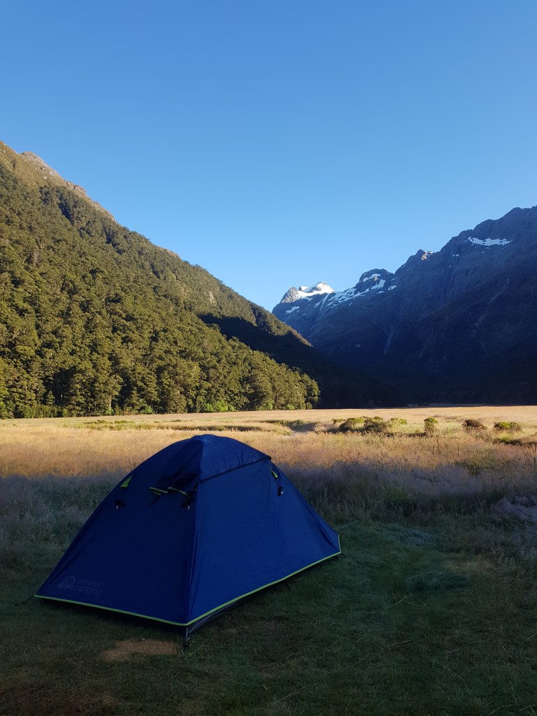 Cette Great Walk de 35km traverse les Alpes du Sud, de la région de Queenstown (Otago) jusqu’à celle de Milford Sound (Southland). La 1ère courte étape nous mène jusqu’au campement de Routeburn Flat, en bord de rivière et face aux montagnes.