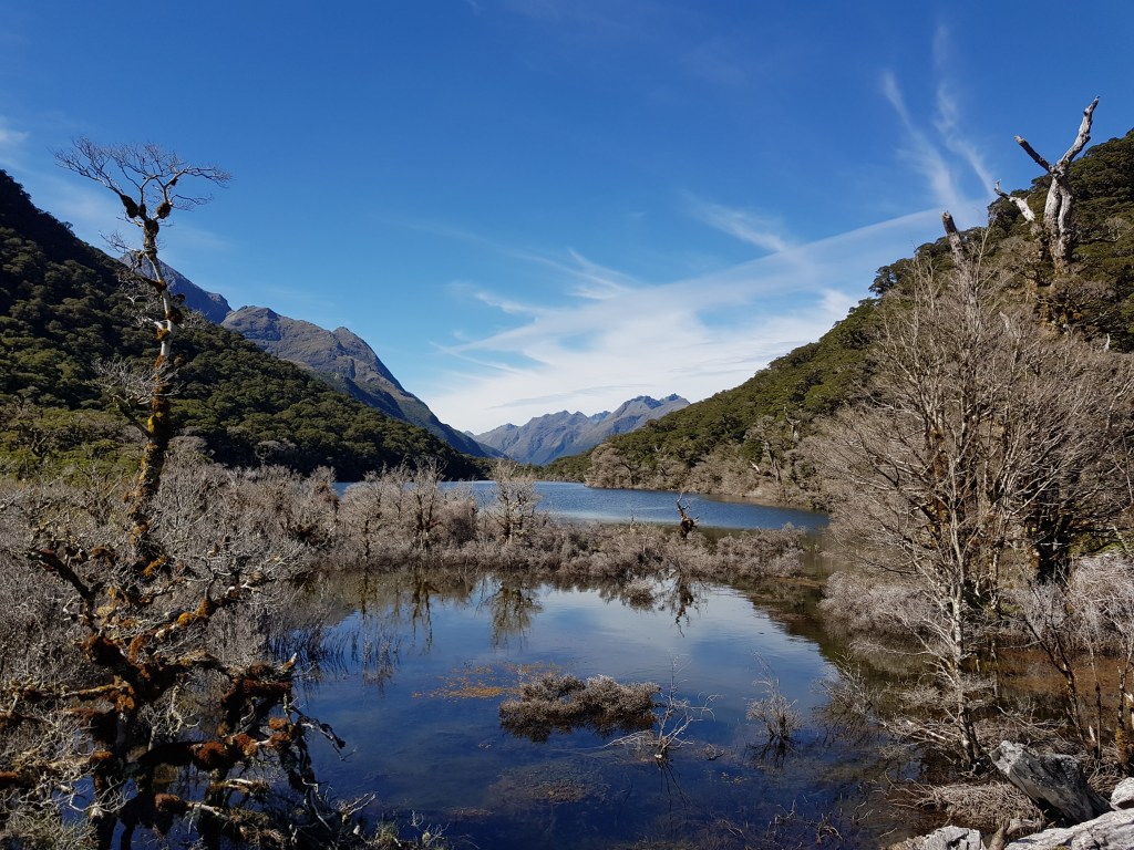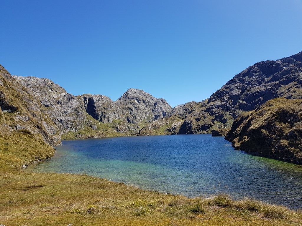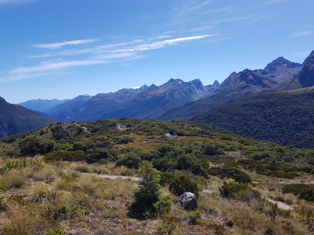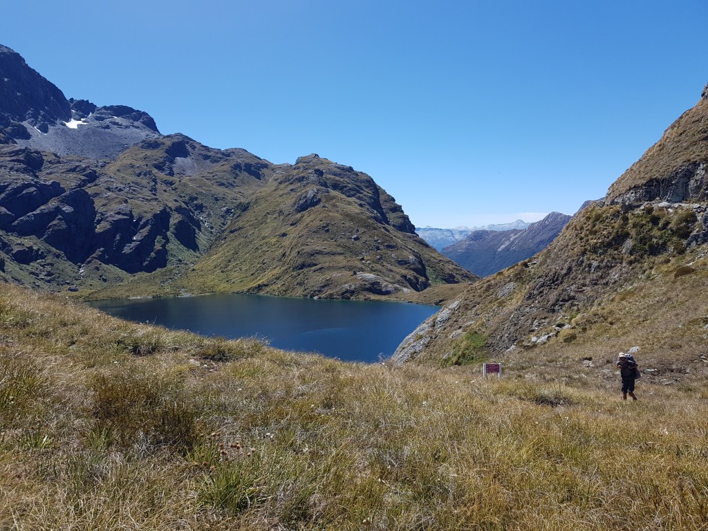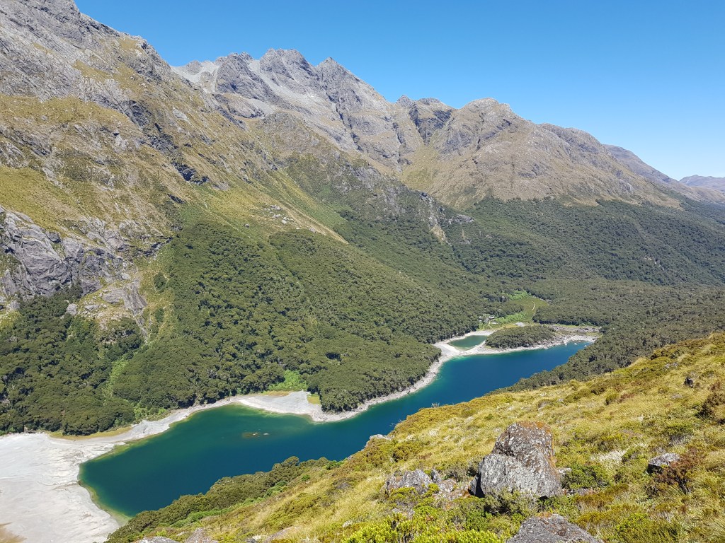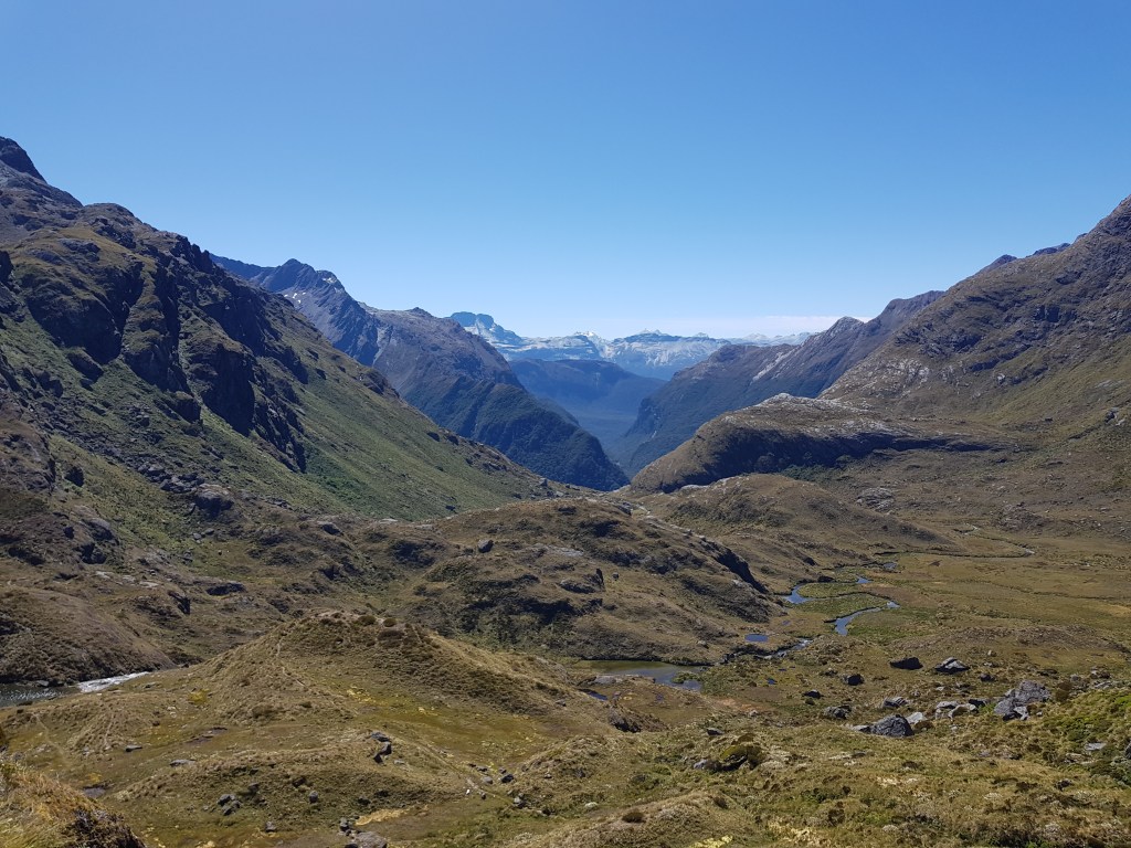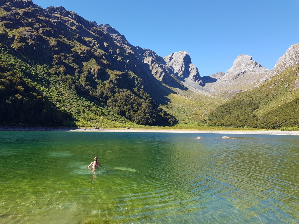 Le 2ème jour est grandiose : vue sur la vallée et le lac Harris, chemin qui longe les montagnes, puis descente au lac Mackenzie pour une fraîche baignade et une 2ème nuit de campement.