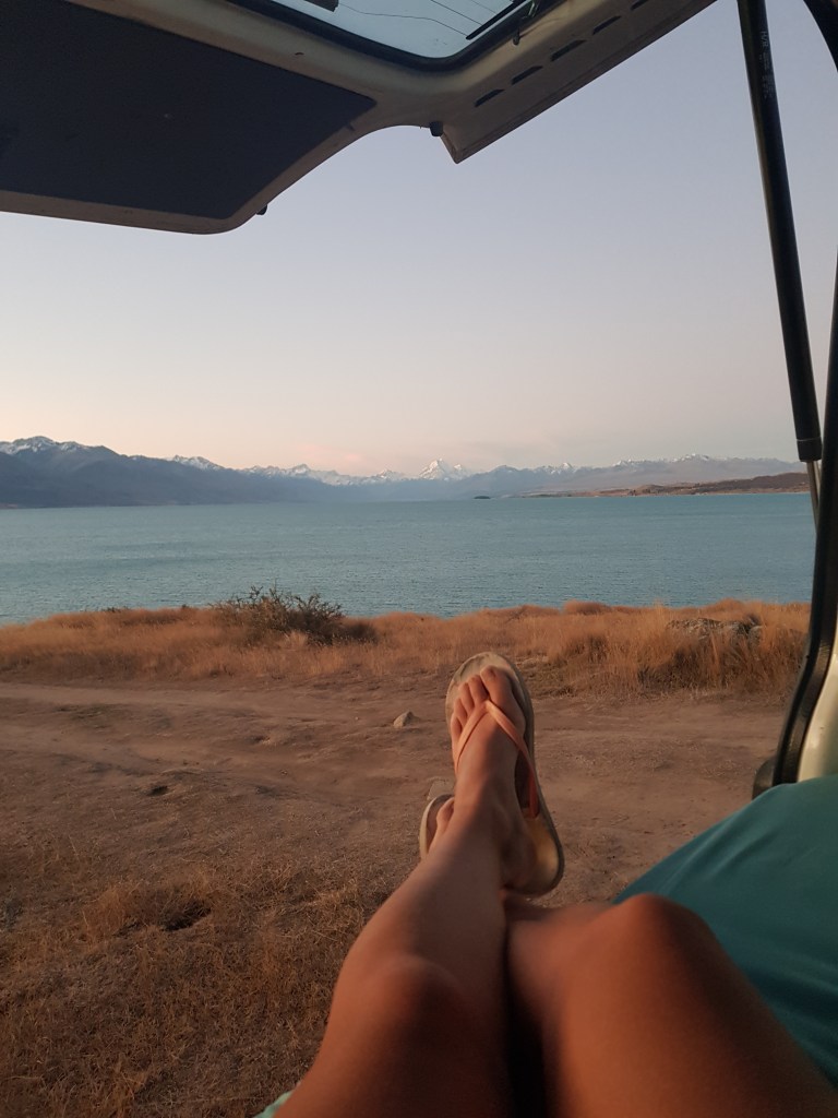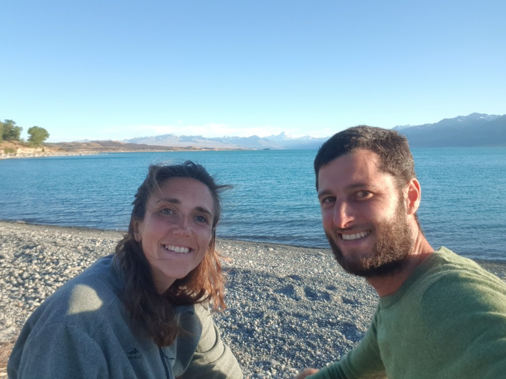 Nous poursuivons la route jusqu’au Lac Pukaki : la couleur bleue de ce lac semble irréelle et la vue sur le Mont Cook au loin est splendide. Nous campons au bord du lac, ce qui nous permet d’apprécier les couleurs au coucher et au lever du soleil.