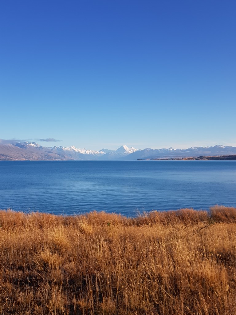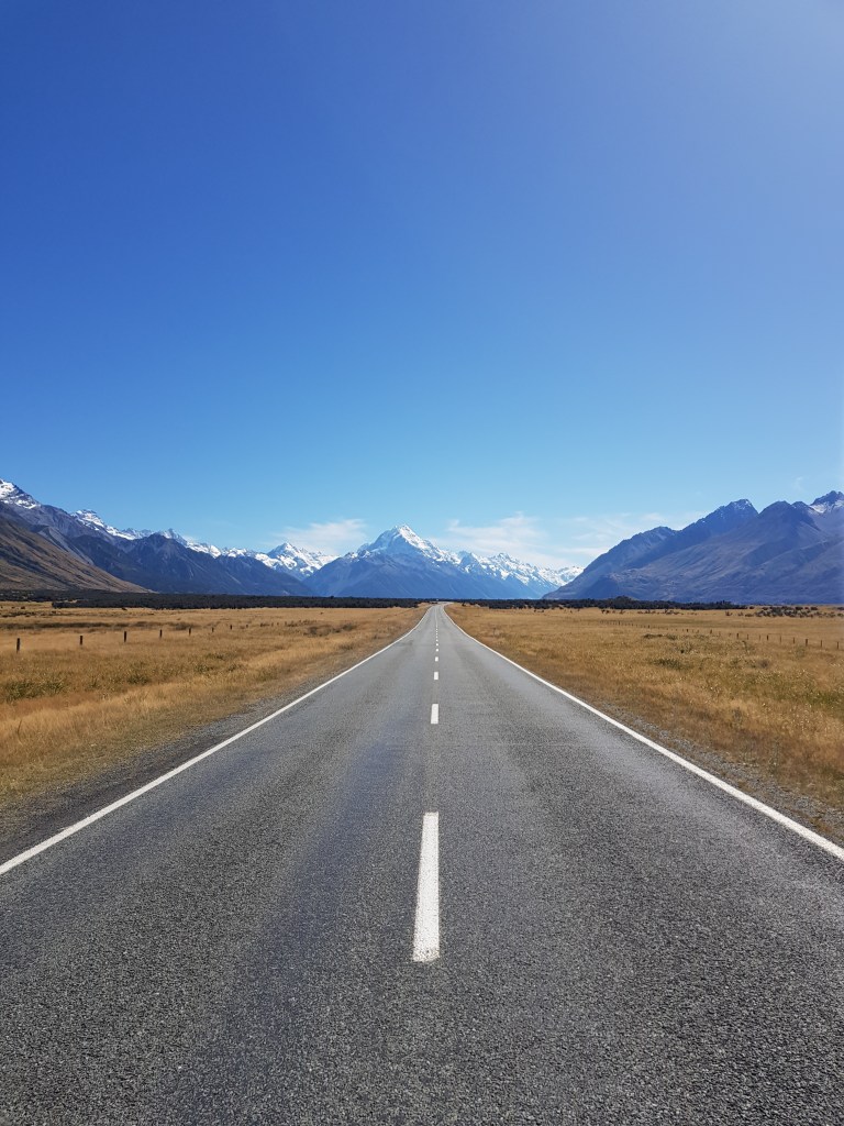 En longeant le Lac Pukaki, nous nous rapprochons du Mont Cook par la route.
