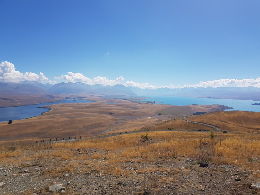En quittant le Mont Cook, on relonge le lac Pukaki et on rejoint le lac Tekapo, tout aussi splendide. Une balade sur le Mont John permet d’avoir de superbes vues sur le lac Tekapo et le lac Alexandrina, juste à côté.