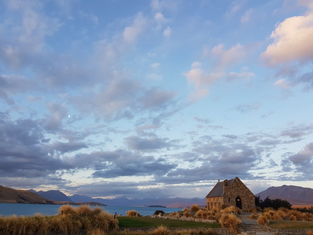 La petite ville de Tekapo est charmante, avec sa petite église en pierre datant de 1935. La « Church of the Good Sheperd » est très photogénique au milieu de ce décor de montagne et de lac.