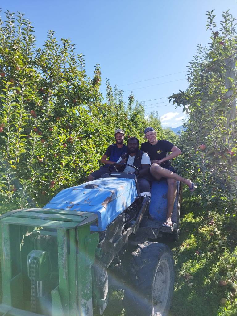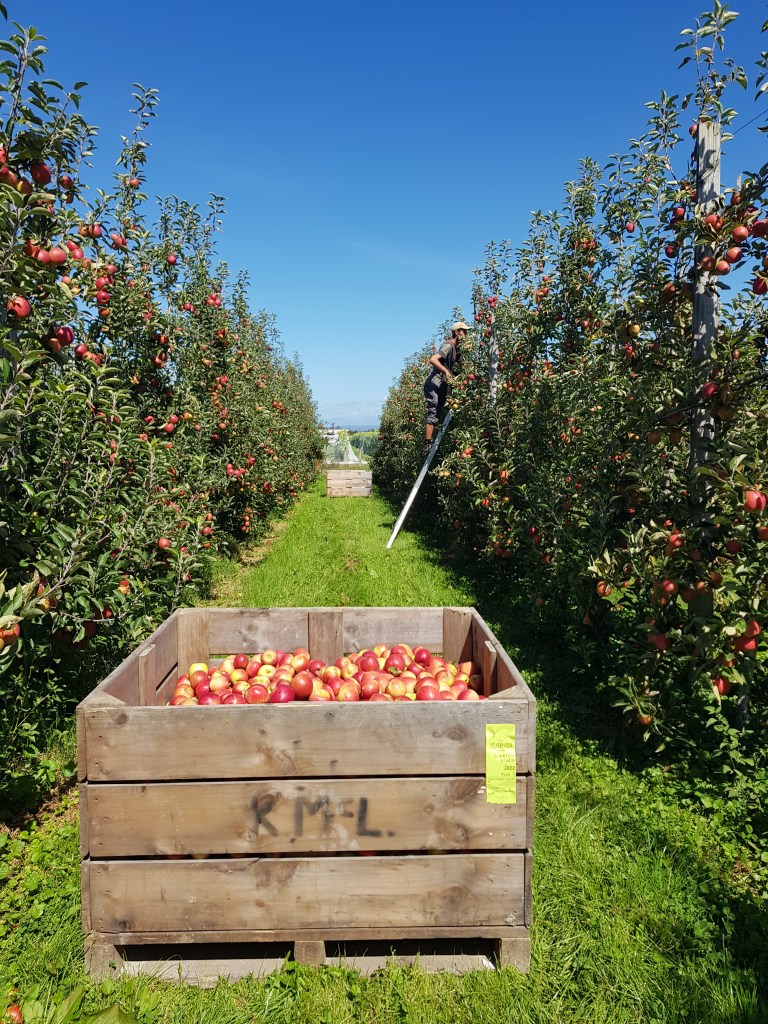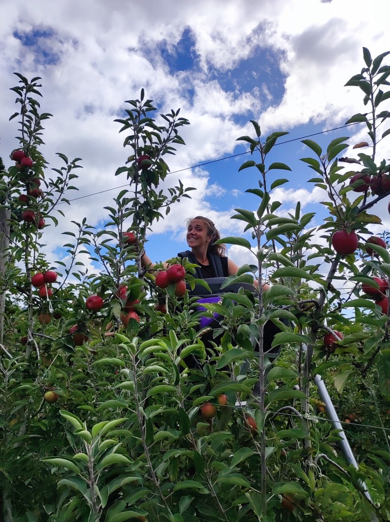 Nous commençons le jour suivant un travail de cueillette de pommes tous les 4, à Motueka. Ce job se révèle très difficile physiquement ! La plupart des pommes se situant très en hauteur, nous devons constamment soulever et déplacer notre échelle. Nous portons un sac pouvant contenir jusqu’à 130 pommes, que nous déversons régulièrement dans une grande caisse en bois appelée « bin ».