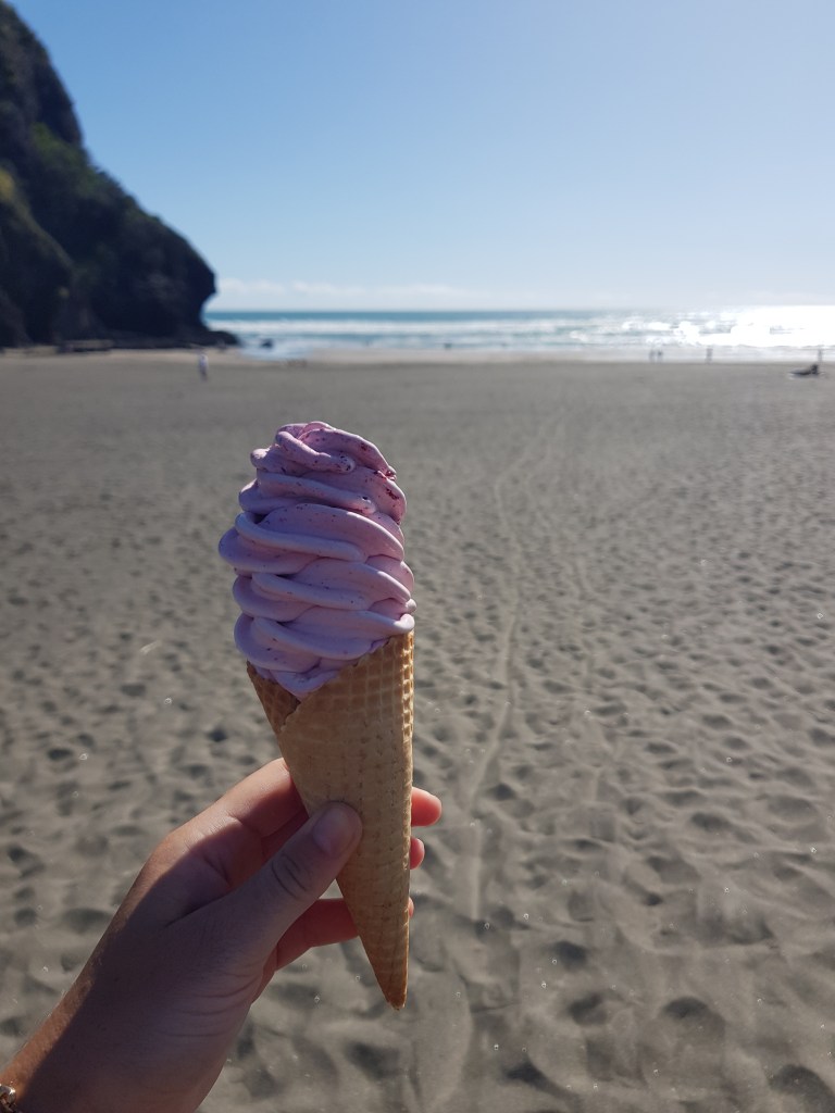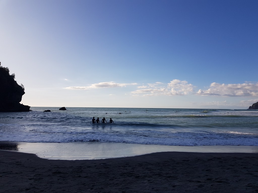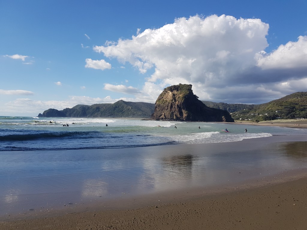 Nous profitons ensuite d’un beau weekend pour séjourner à Piha, à 45minutes à l’ouest d’Auckland. N’ayant plus le van, nous louons une voiture et campons dans notre tente, dans un joli camping proche de la mer.